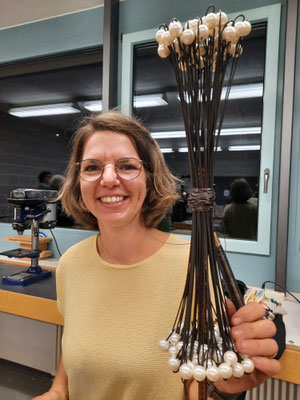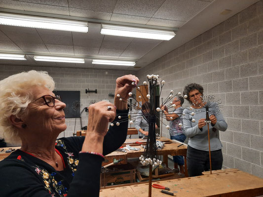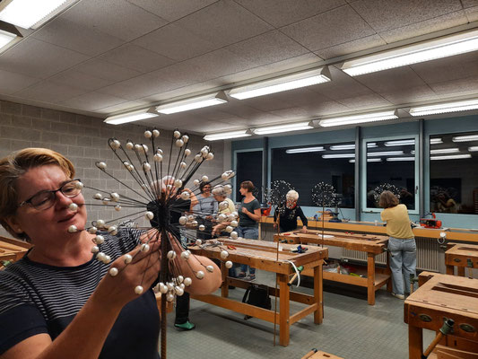 sympathische Regula Herzog wurden Drähte und Perlen abgezählt und dann aufgefädelt. Mit viel Elan waren alle dabei und 2 Stunden später hatten alle eine Pusteblume fertig oder sogar die zweite in